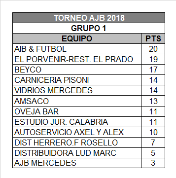 En lo que respecta a la cima de la tabla de posiciones, nada se modificó. AIB & Fútbol, de la mano del “Turco” Bacri, derrotó por goleada cinco a cero a los chicos de Amsaco. Este team ya empieza a acercarse más y más al anhelo de todos, la copa. Como se mencionó anteriormente, El Porvenir-Restaurante El Prado mostró una goleada increíble. Su víctima fue la AJB Mercedes. Finalizado el tiempo reglamentario de juego, el tanteador culminó trece a dos. El escolta está a solo un punto de AIB&Fútbol.