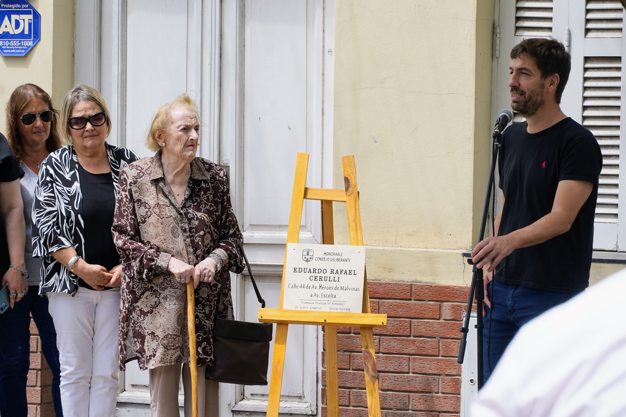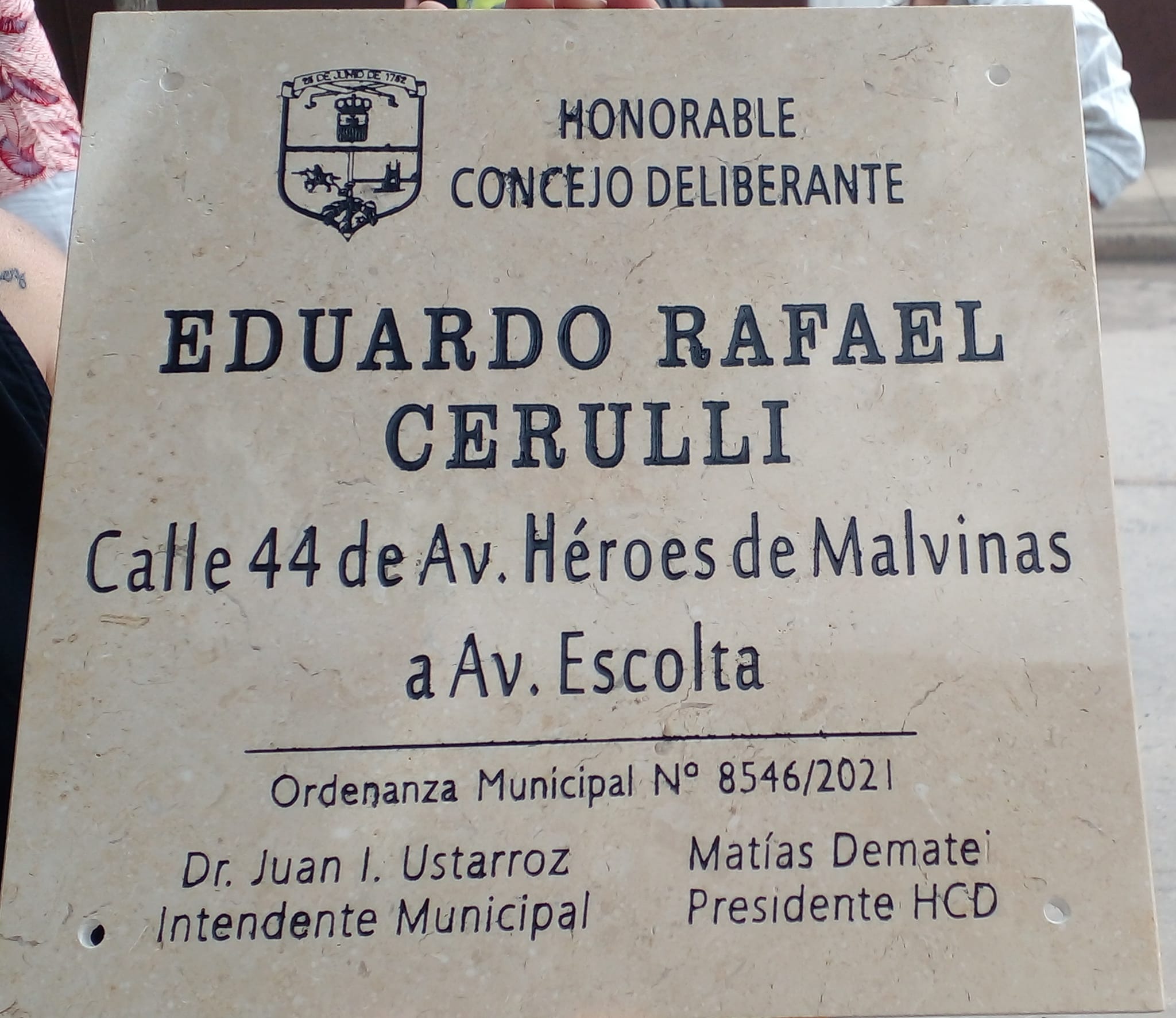 Este jueves por la mañana se llevó a cabo la colocación formal del nombre de Eduardo Cerulli a la calle 44 de Escolta a Héroes de Malvinas. Participaron de la actividad integrantes de su familia, amistades, políticos, vecinos y vecinas. El intendente Juan Ustarroz fue uno de los oradores y también hablaron los ex concejales Oscar Albini y Juan Carlos Benitez y la actual edil Silvia Juarez.