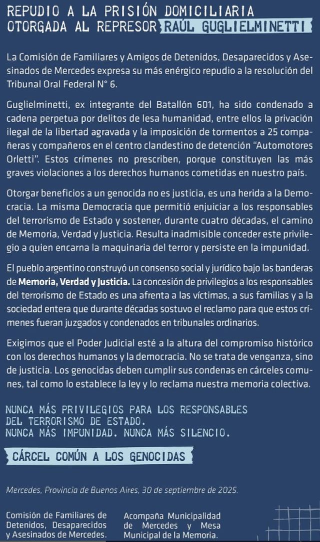 La noticia sobre la posible concesión de prisión domiciliaria a Raúl Guglielminetti, alias “Mayor Guastavino”, ex agente civil de inteligencia del Ejército y condenado por crímenes de la última dictadura cívico-militar, generó una profunda indignación en parte de la comunidad mercedina.