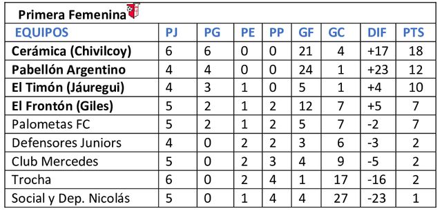 Continuó en la noche del miércoles 1 de noviembre la sexta fecha de Primera en el Fútbol Femenino con el empate de Trocha y Mercedes en 15 y 42. El domingo El Frontón goleó a Nicolás y el viernes Cerámica a Palometas. A quedado pendiente Defensores vs. Pabellón y de la tercera adeudan el juego El Timón vs. Social y Deportivo Nicolás.