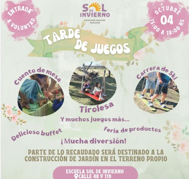 La comunidad de la Escuela Sol de Invierno, que aplica la Pedagogía Waldorf, invita a vecinos y familias a participar de una «Tarde de Juegos» solidaria este sábado 4 de octubre.