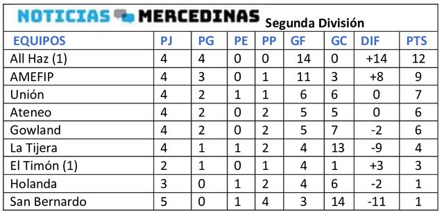 Este sábado la Liga Mercedina de Fútbol tuvo partidos de la quinta fecha, por la Segunda División llegó a su cuarta victoria consecutiva All Haz y con ello sigue liderando la categoría, sin tener goles en su arco. Se impuso a Gowland en la mitad de la tarde, un equipo que terminó con dos hombres menos.