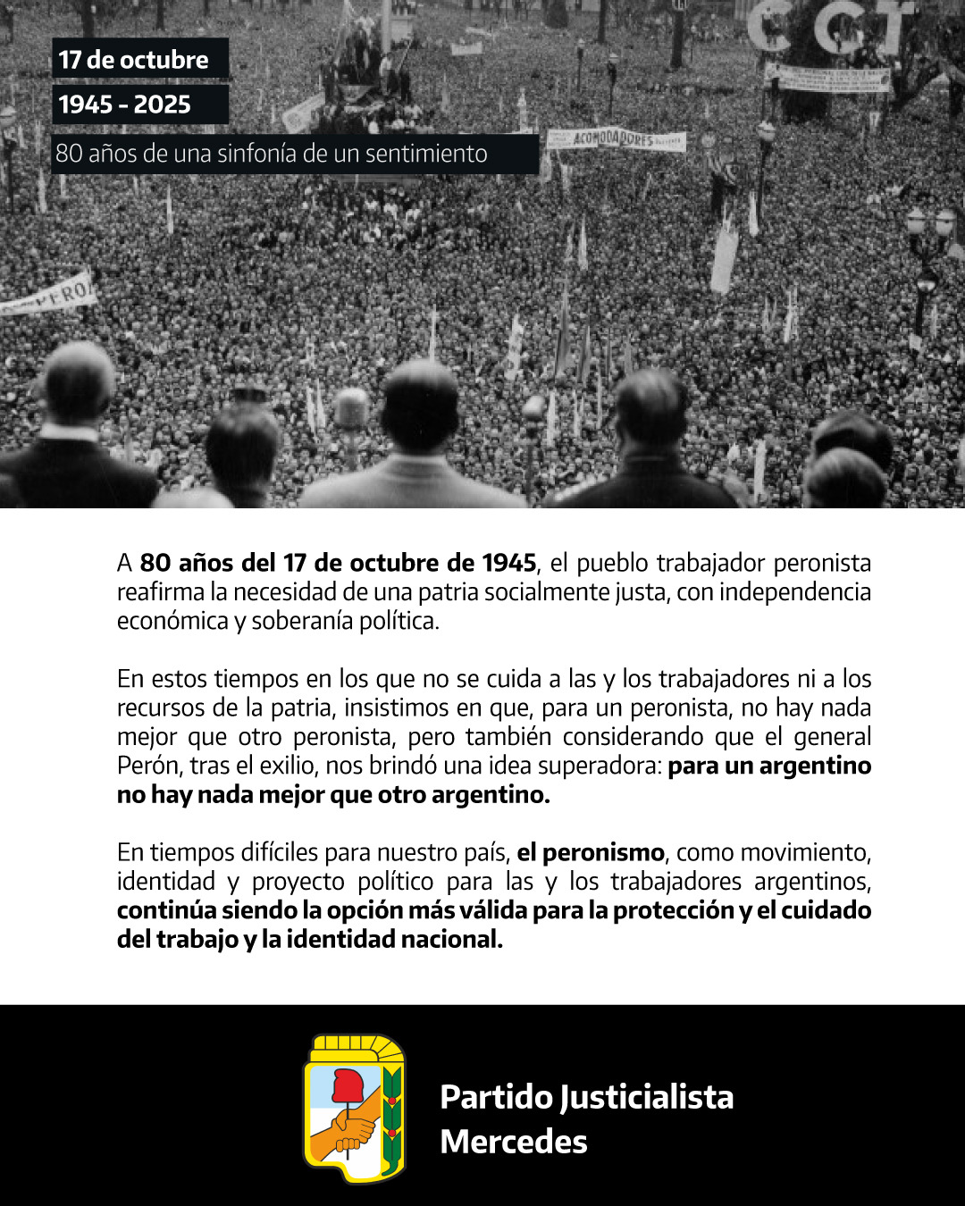 El justicialismo mercedino se prepara para una celebración de alto significado histórico y político: los 80 años del Día de la Lealtad Peronista. La jornada conmemorativa, que recuerda la masiva movilización de trabajadores y sectores populares que logró la liberación del General Perón de su encarcelamiento, tendrá su epicentro en la ciudad.