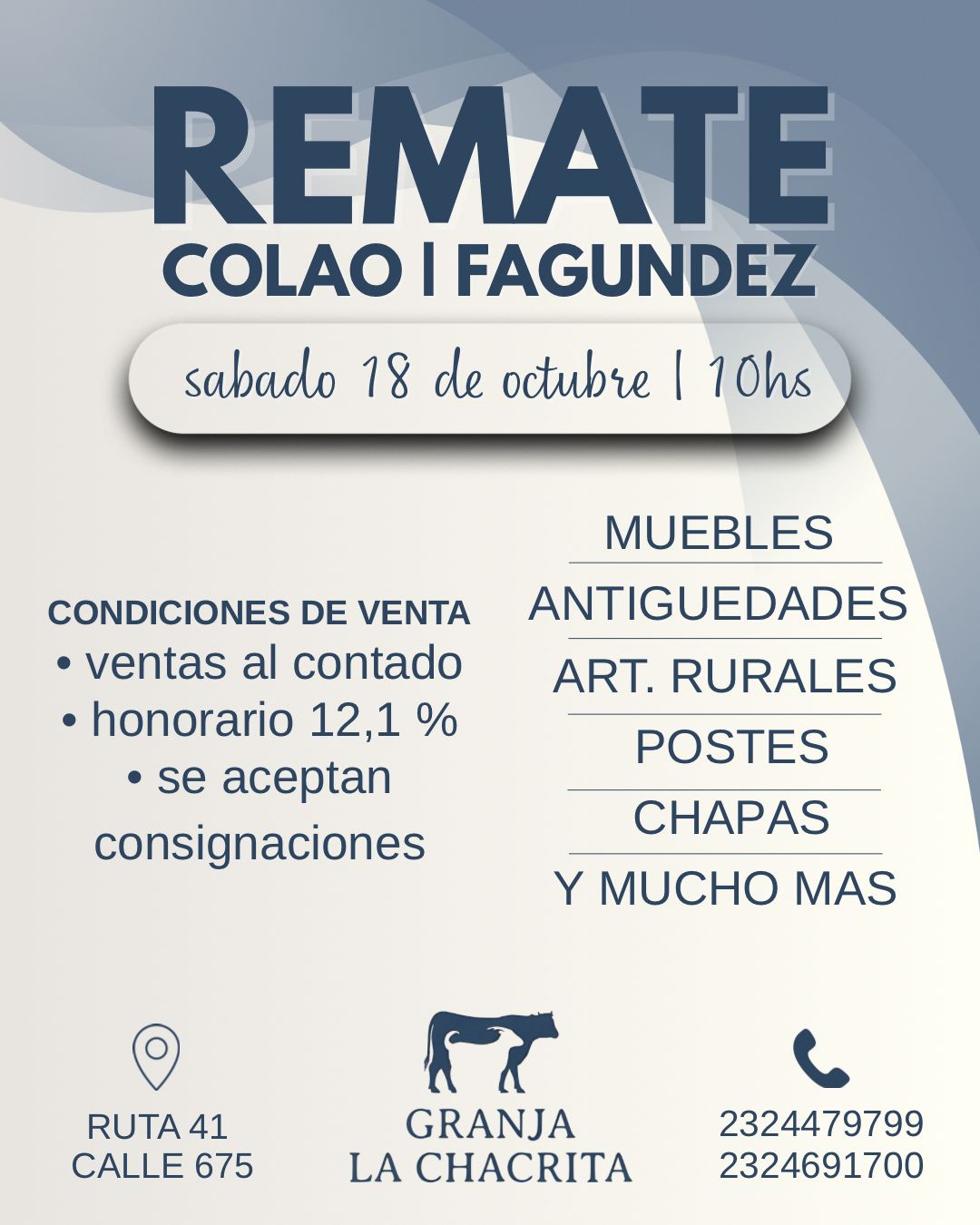 El martillo de los profesionales Luis Colao y leo Fagundez volverá a sonar este sábado 18 de octubre a las 10:00 horas con un nuevo remate que se llevará a cabo en Granja La Chacrita, ubicada en la Ruta 41, Calle 675.