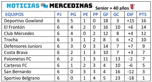 El Fútbol Senior + 40 años de la Liga Mercedina atravesó durante miércoles y jueves la sexta fecha, el puntero Deportivo Gowland ganó su partido mientras que Frontón que sigue siendo escolta también se quedó con el resultado. Otro que marcha cerca es Club Mercedes que se impuso sobre Costa Brava. El detalle de los resultados dela fecha, lo que viene y posiciones:
