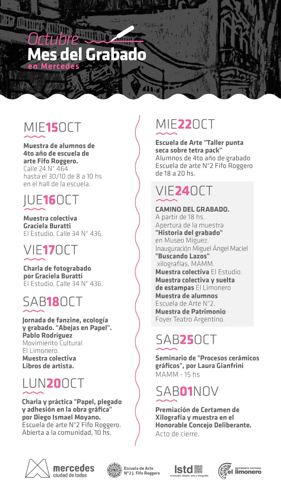 La intensa agenda comenzó el 15 de octubre e incluyó la muestra de alumnos de 4to año de la Escuela de Arte, la muestra colectiva y una charla de fotograbado con Graciela Buratti en El Estudio, y la jornada de fanzine, ecología y grabado «Abejas en Papel», a cargo de Pablo Rodríguez.