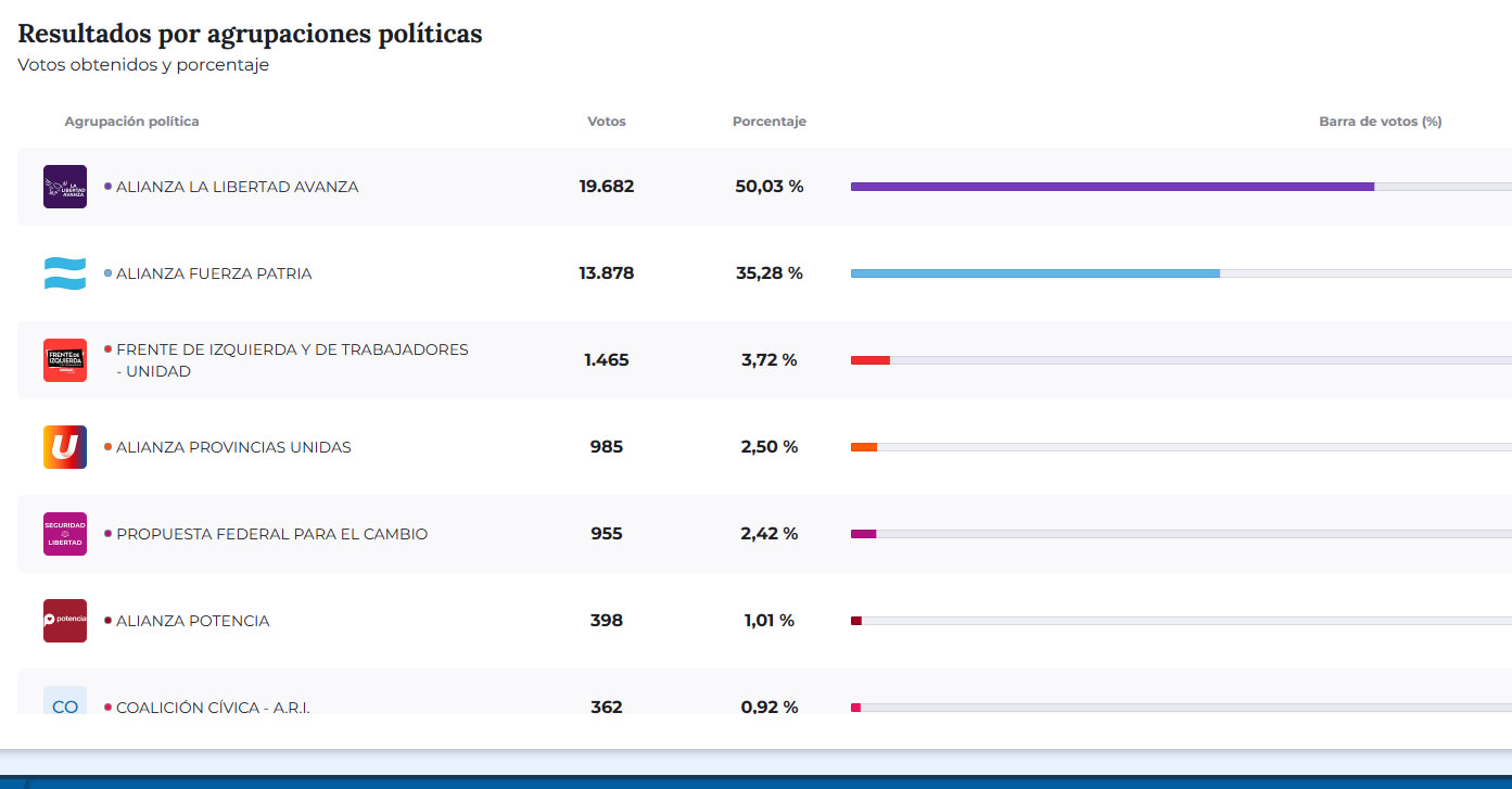 De esta manera se confirma una clara victoria de Alianza La Libertad Avanza (LLA), mientras que los datos provinciales reflejan una ajustadísima contienda por la representación en Diputados Nacionales.