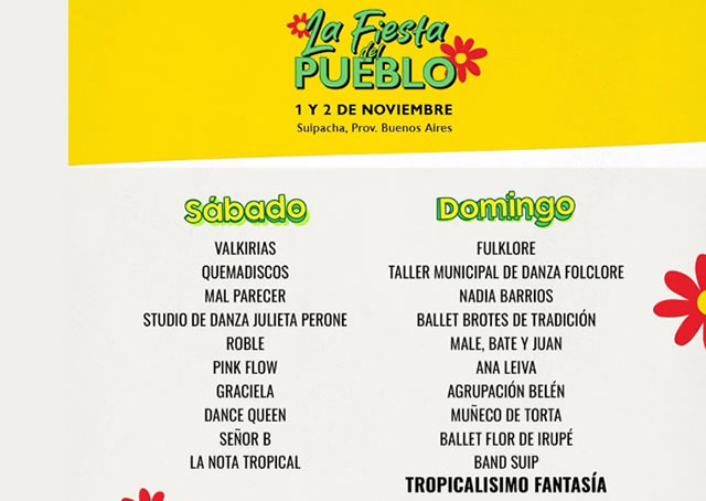 La vecina localidad de Suipacha se vestirá de fiesta este fin de semana para celebrar la «Fiesta del Pueblo» en su 161° Aniversario. El evento se desarrollará el sábado 1 y domingo 2 de noviembre en la Plaza Balcarce.