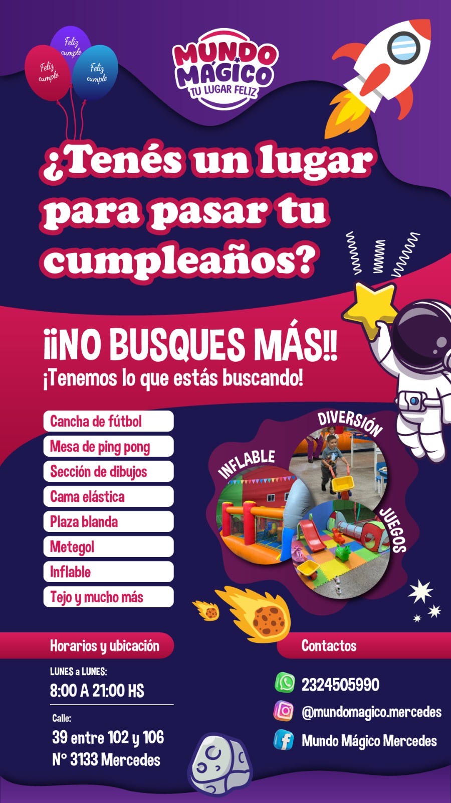 Todo el mes de noviembre de 2025, Mundo Mágico (Tu Lugar Feliz), el salón de fiestas más completo y práctico de Mercedes, ofrece una promoción singular que ahora extiende a todo el mes. Se trata de un descuento del 20% en la reserva de eventos.