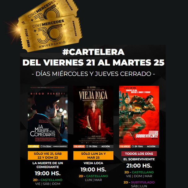 El Cine Mercedes continúa con los festejos por su 30° aniversario en la ciudad, manteniendo la promoción especial de 2×1 todos los días de la semana en sus funciones.