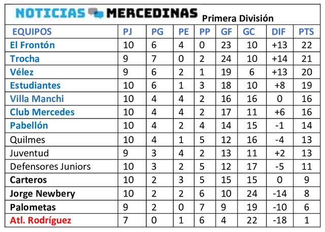 La décima fecha de Primera continuó este martes 18 en cancha de la Liga, sólo hubo un partido que lo ganaba Mercedes por la mínima al término del primer tiempo. Antes del minuto de iniciado el complemento lo empató Carteros, resultado que no volvió a modificarse. El “Blanquinegro” sigue en zona de Reducido, Cartero en el lote de abajo. Este miércoles culmina la fecha con dos importantes encuentros.