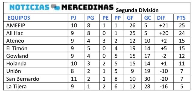 La Liga Mercedina de  Fútbol en su Segunda División ha tenido dos días de actividad, el sábado alcanzaba un triunfo más Holanda y con ello se va recuperando, fue frente a Gowland que sigue en caída. El que goleó y al momento está otra vez en la cima es AMEFP, superó ampliamente a San Bernardo pese a llegar sobre la hora a cancha de la Liga el último sábado.