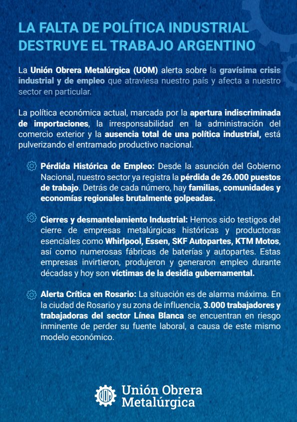La UOM subraya que estas empresas generaron empleo durante décadas y hoy son «víctimas de la desidia gubernamental». La organización afirma que la apertura sin control de las importaciones no genera competencia ni eficiencia, sino que «destruye la Industria Nacional» , beneficiando solo a un puñado de importadores.