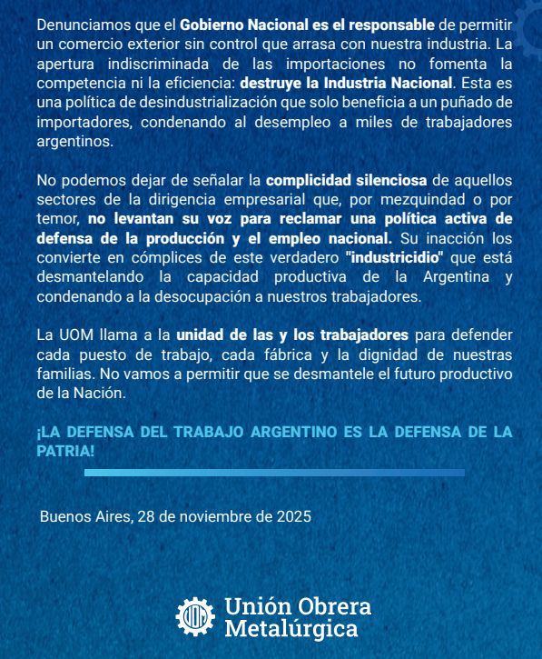 Finalmente, la Unión Obrera Metalúrgica realiza un llamado a la unidad de los trabajadores para defender «cada puesto de trabajo, cada fábrica y la dignidad de nuestras familias».