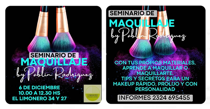 El espacio cultural El Limonero, ubicado en la intersección de Calle 34 y 27, será la sede de un Seminario de Maquillaje intensivo a cargo de Pablín Rodríguez. La capacitación está programada para este sábado 6 de diciembre, en el horario de 10:00 a 12:30 hs.