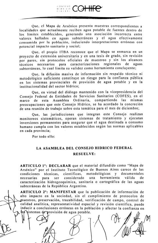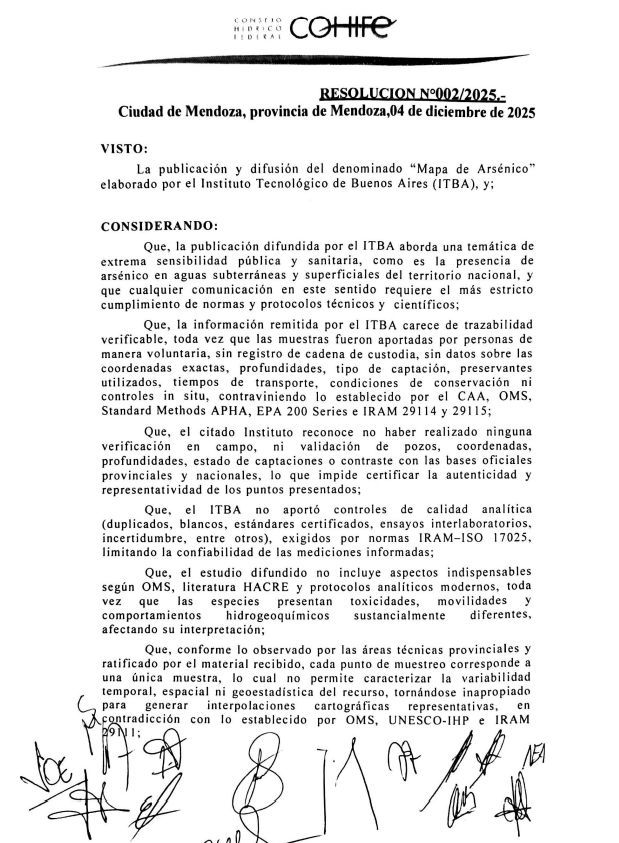 La Asamblea del COHIFe, reunida el 4 de diciembre de 2025 en Mendoza , emitió la Resolución N° 002/2025 , que declara oficialmente que el material difundido por el ITBA «carece de las condiciones técnicas, científicas, metodológicas y documentales necesarias para ser considerado una herramienta válida de caracterización hidrogeoquímica, sanitaria o cartográfica».