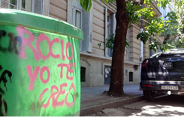 Hay imágenes que logran capturar la complejidad de un conflicto social con apenas unos elementos. La fotografía adjunta y que encabeza este artículo muestra un contenedor de basura verde, intervenido con un grafiti en pintura rosa: «ROCÍO YO TE CREO».