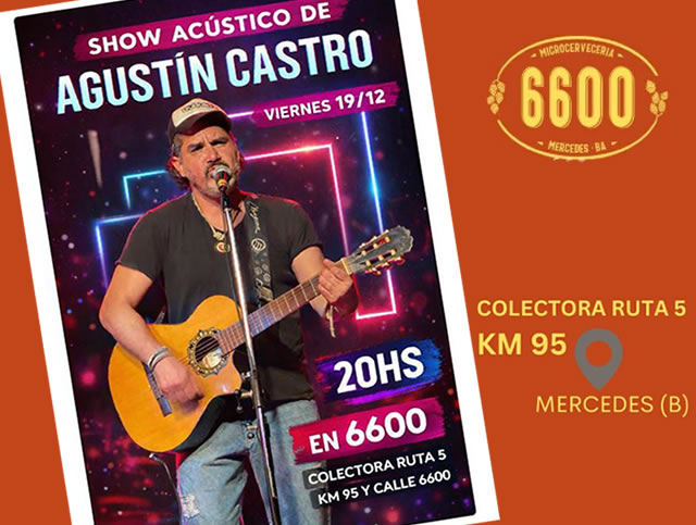 Este viernes 19 de diciembre a las 20:00 hs, Agustín Castro se presentará en Microcervecería 6600 (Colectora Ruta 5 Km 95 y Calle 6600), un espacio gestionado por su amigo Arturo Puga, donde el artista se siente «como en casa».