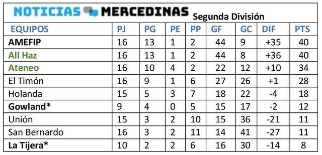 Justamente con All Haz finalizó empatada la primera posición y por haberle ganado los dos cruces de la fase regular hubo copa y festejo, título de Segunda que fue festejado cerca de la medianoche del jueves en la Liga, compartiéndose todo con los seguidores y familias que se acoplaron en un año donde la cima fue disputada en cada fecha, la tabla muestra lo sucedido.