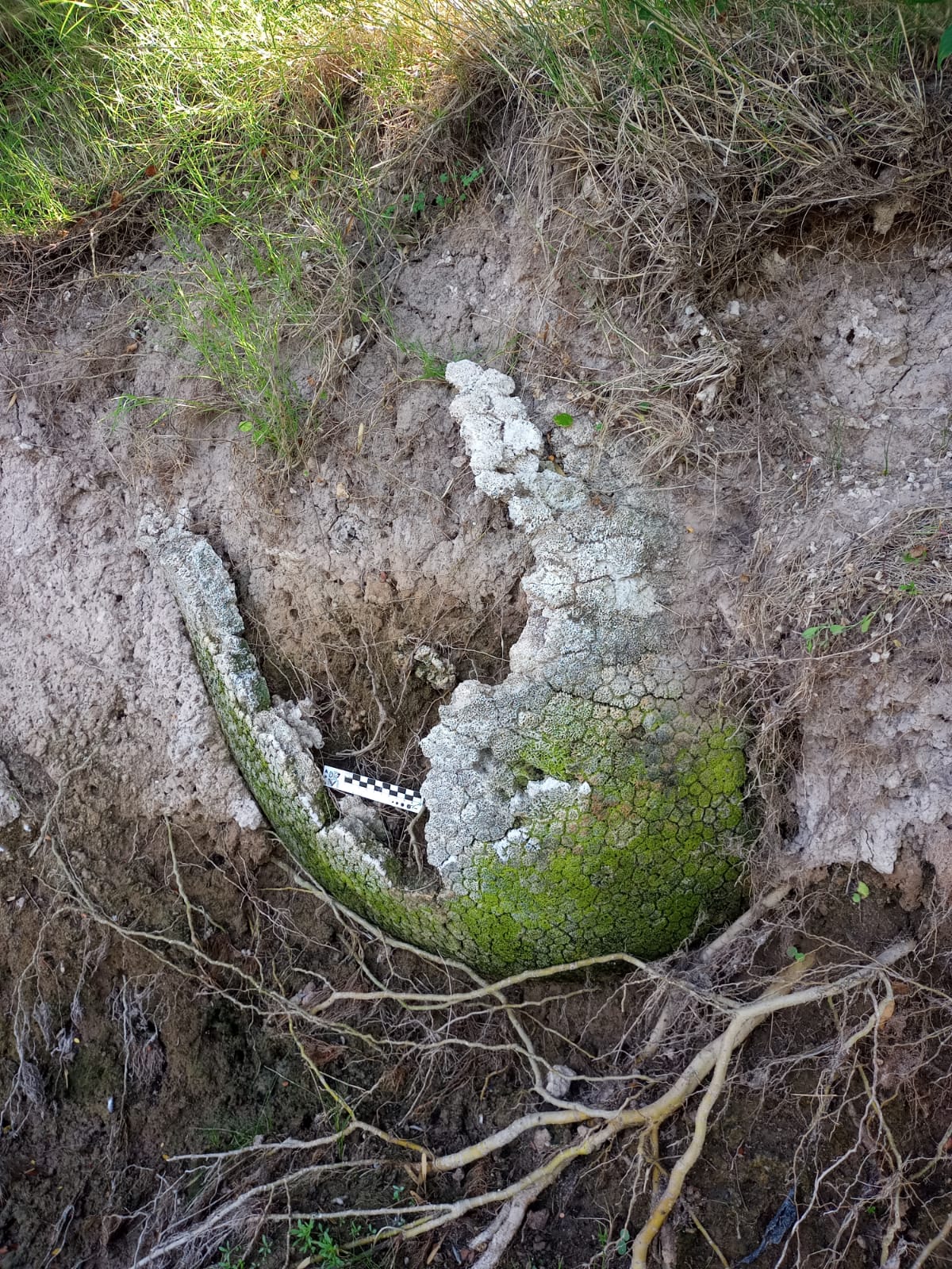 El material hallado corresponde a un caparazón de un Glyptodon reticulatus. Según informaron los especialistas, el fósil se encontraba en posición de cúbito lateral izquierdo, a escasos centímetros de la margen derecha del río Areco, en un entorno natural característico del campo bonaerense.