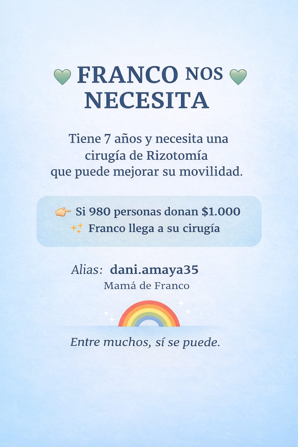 El monto necesario para costear este servicio especializado es de $980.000. Con el fin de que la cifra no resulte inalcanzable, la familia ha lanzado una campaña basada en la fuerza de la comunidad: «Si 980 personas donan $1.000, Franco llega a su cirugía».