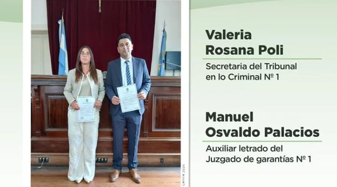 Los profesionales que prestaron juramento y asumieron sus respectivos roles son la doctora Valeria Rosana Poli, quien asumió como Secretaria del Tribunal en lo Criminal Nº 1; y el doctor Manuel Osvaldo Palacios, que se incorporó como Auxiliar Letrado del Juzgado de Garantías Nº 1.
