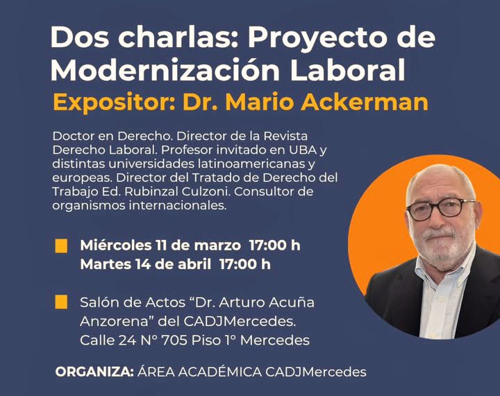El Colegio de Abogados del Departamento Judicial de Mercedes (CADJM) anunció la realización de un destacado ciclo de capacitación titulado «Proyecto de Modernización Laboral», que contará con la disertación magistral del Dr. Mario Ackerman.
