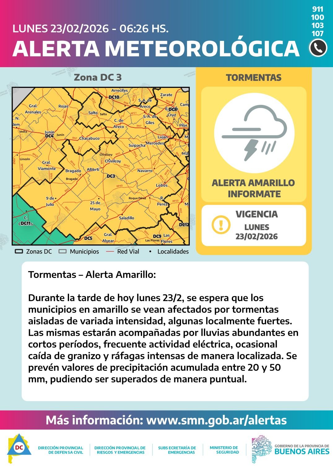 La Dirección Provincial de Defensa Civil emitió una alerta meteorológica amarilla que afecta directamente al municipio de Mercedes y localidades vecinas de la Zona DC 3 para la tarde de este lunes 23 de febrero.