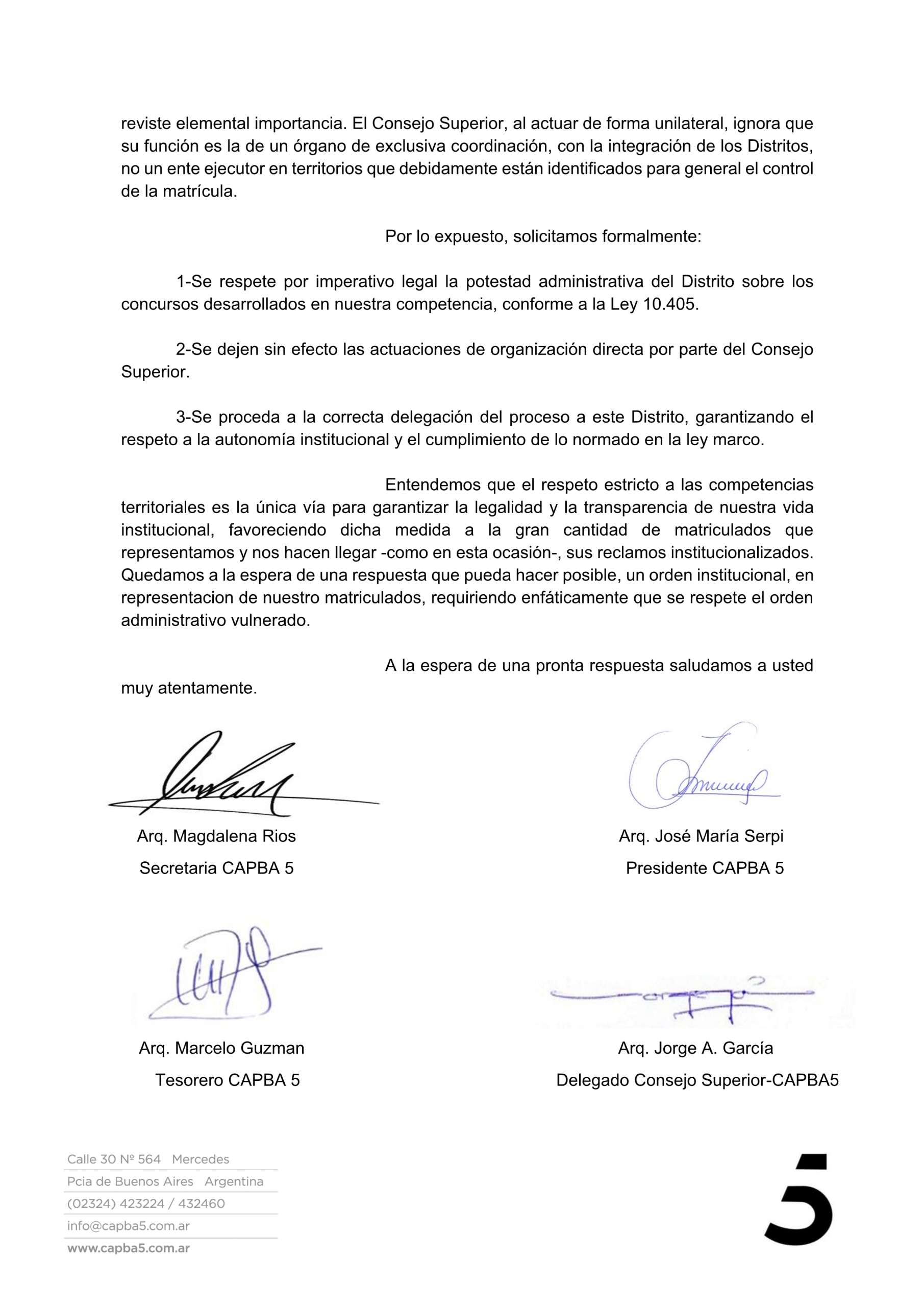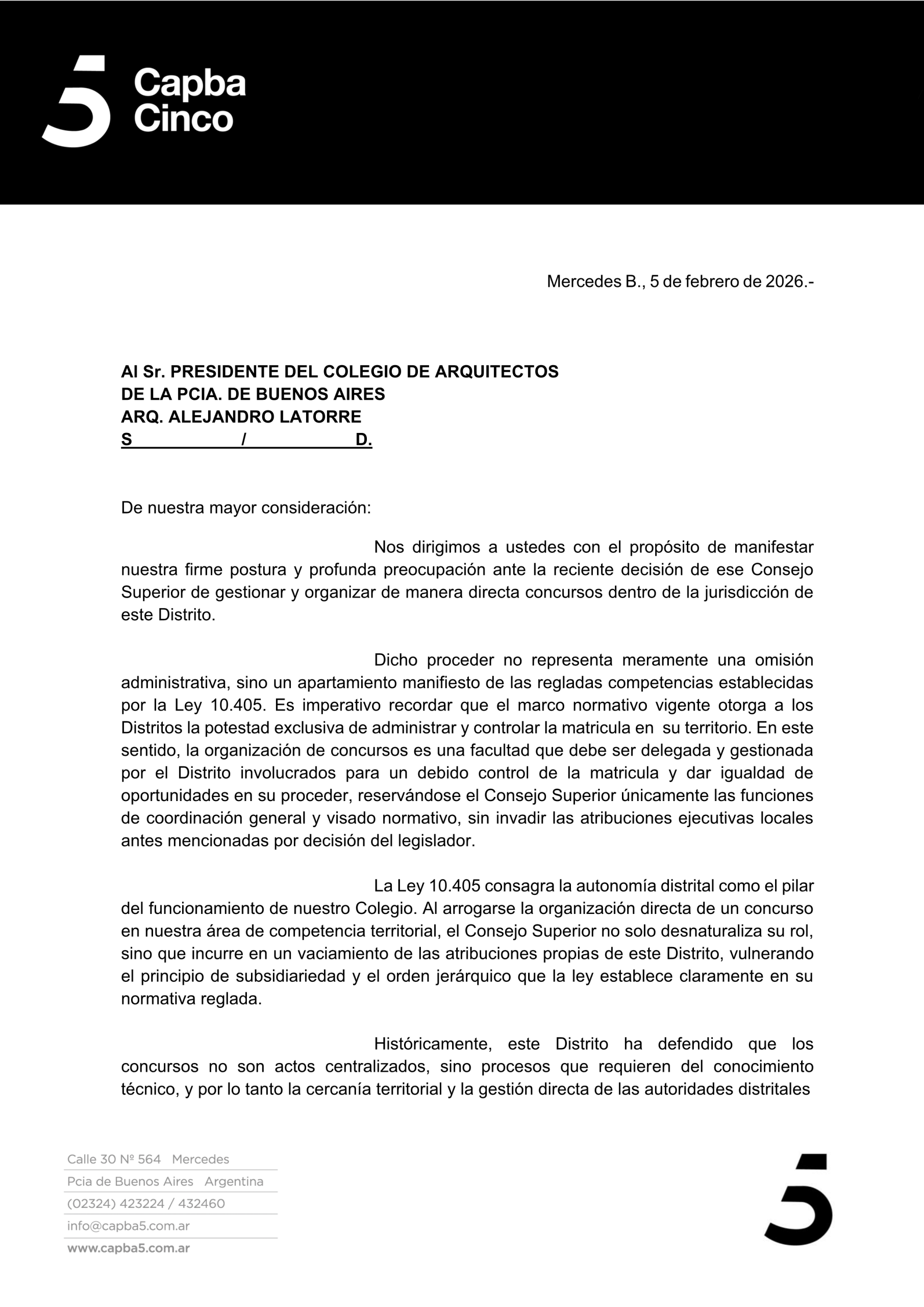 El pasado 5 de febrero, las autoridades locales elevaron una nota formal al presidente del Consejo Superior del CAPBA, Arq. Alejandro Latorre, denunciando la gestión directa de concursos dentro de su jurisdicción.