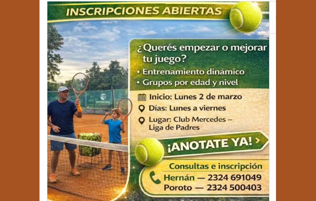 La reconocida Escuela de Tenis que funciona en el Club Mercedes – Liga de Padres anunció la apertura de inscripciones para su ciclo 2026, invitando a niños, jóvenes y adultos a sumarse a sus filas.