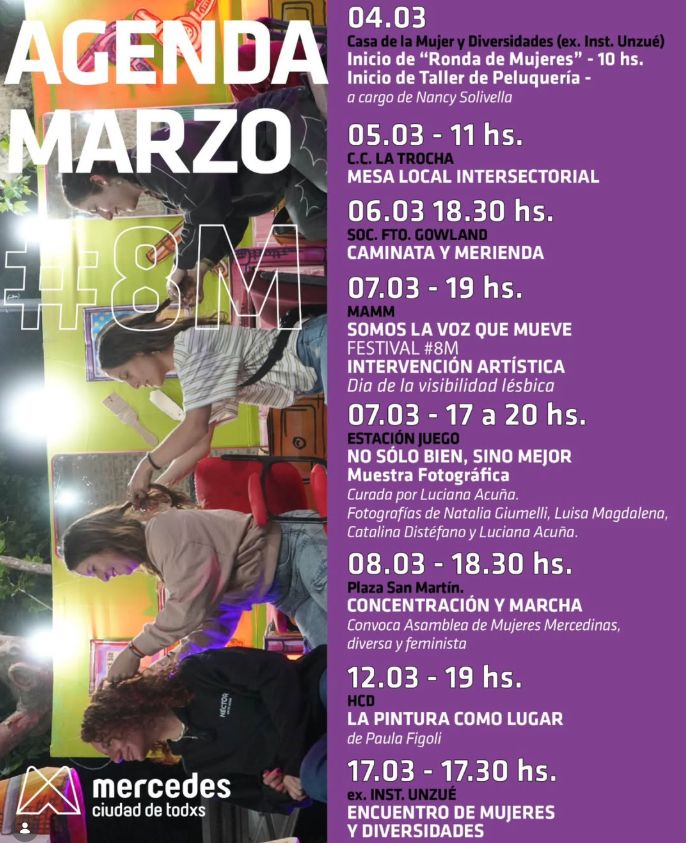 • Movilización Central (08.03): El Día Internacional de la Mujer Trabajadora contará con una concentración y marcha en Plaza San Martín a las 18:30 hs, convocada por la Asamblea de Mujeres Mercedinas, diversa y feminista.