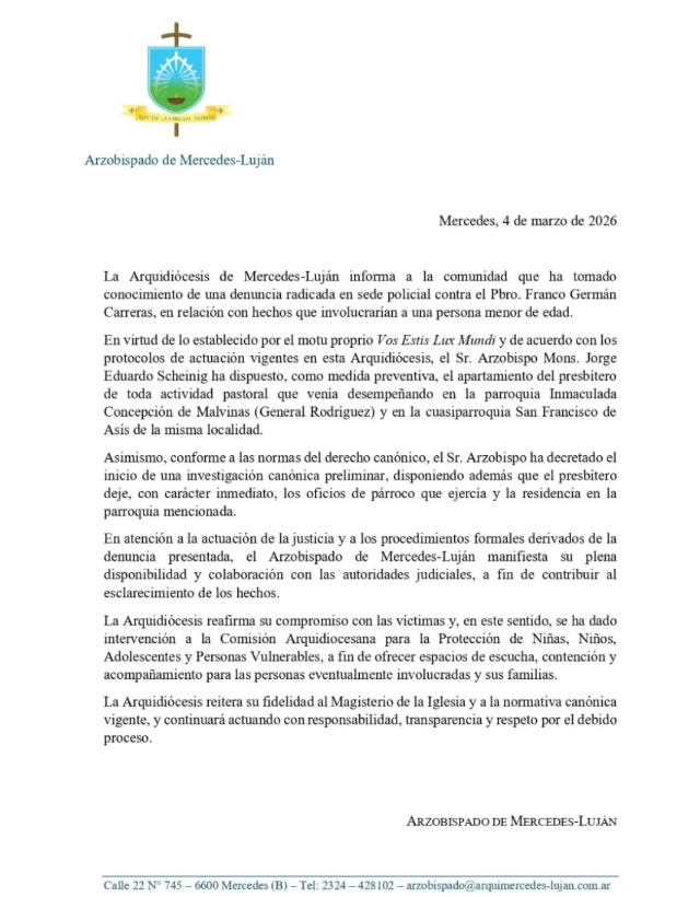 A través de un comunicado oficial emitido este miércoles, la Arquidiócesis de Mercedes-Luján informó a la comunidad la aplicación de medidas preventivas sobre el Pbro. Franco Germán Carreras, a raíz de una denuncia radicada en sede policial por hechos que presuntamente involucrarían a una persona menor de edad.