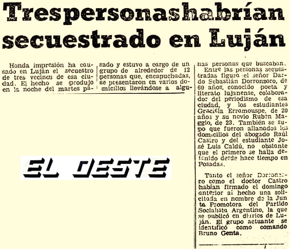 El matutino destacaba: “Honda impresión ha causado en Luján el secuestro de tres vecinos en esa ciudad. El hecho se produjo en la noche del martes pasado y estuvo a cargo de un grupo de alrededor de 12 personas que, encapuchadas se presentaron en varios domicilios llevándose algunas personas que buscaban.”