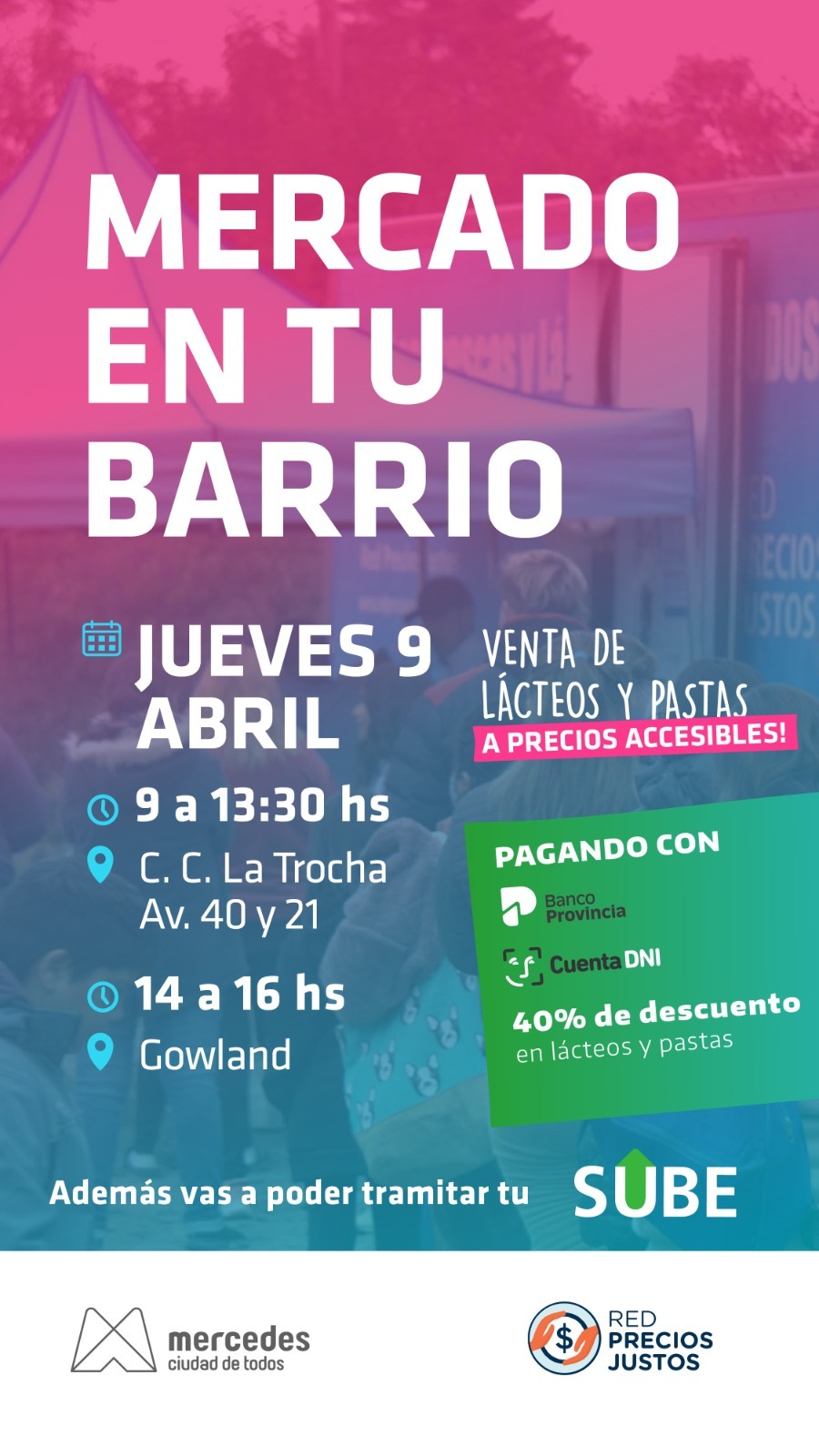Además, se informó que durante la jornada los vecinos podrán acercarse para realizar trámites relacionados con la tarjeta SUBE, unificando así servicios municipales y beneficios comerciales en un mismo espacio.