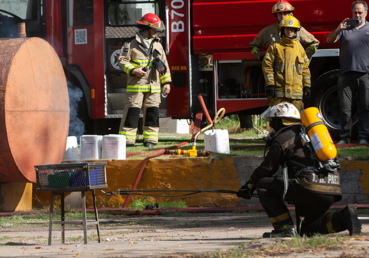 Durante el ejercicio, se incendiaron de forma supervisada un automóvil, fardos y baterías. Los asistentes pudieron observar en tiempo real el comportamiento térmico del litio y aplicar las maniobras de sofocación con agentes específicos aprendidas durante el bloque teórico.