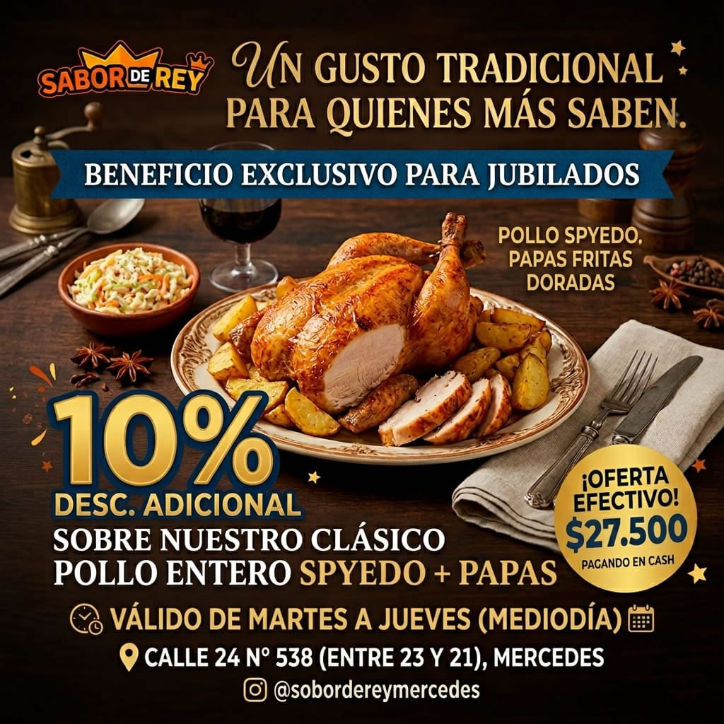 - Exclusivo Jubilados: Pensado para quienes valoran el sabor tradicional, el local ofrece un 10% de descuento adicional sobre su clásico combo de Pollo entero al Spiedo con papas fritas doradas. El precio promocional para esta categoría, abonando en efectivo, es de $27.500, representando un alivio directo para el consumo de los adultos mayores.