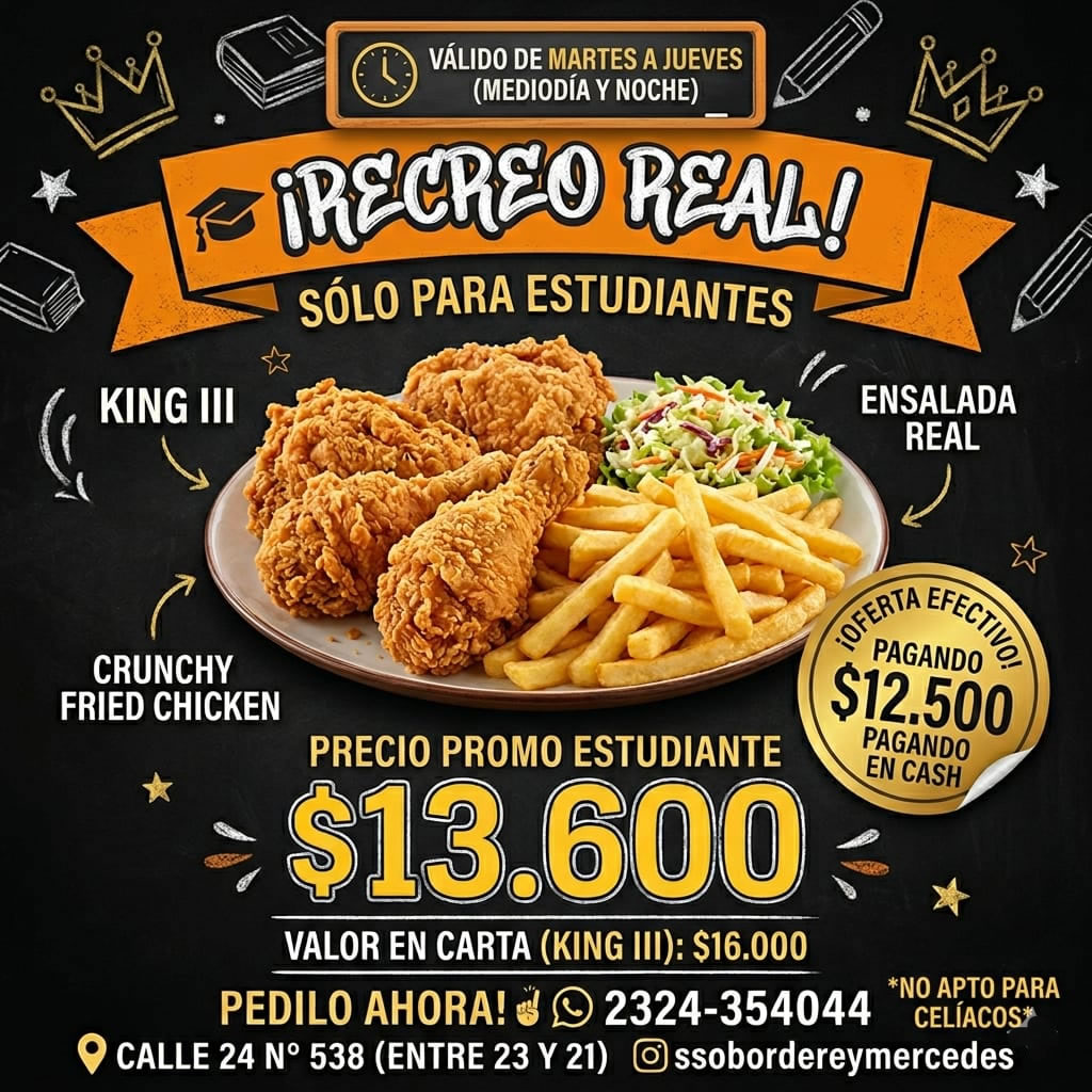 - Recreo Real para Estudiantes: Bajo el nombre de «King III», se presenta un combo diseñado para los jóvenes que necesitan un almuerzo rápido y contundente. Consiste en Crunchy Fried Chicken (pollo frito estilo crispy) acompañado de papas fritas y ensalada real. Mientras el valor de carta es de $16.000, los estudiantes podrán acceder a un precio especial de $13.600 ($12.500 si abonan en efectivo).