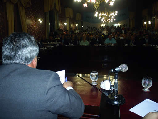 02/04/07 Cumpliendo con lo establecido en la Ley Orgánica de las Municipalidad este domingo 1º de abril pasadas las 20 horas se llevó adelante la apertura de sesiones ordinarias en el Honorable Concejo Deliberantes de Mercedes a cargo del primer mandatario comunal, Carlos Américo Selva. En primer lugar los ediles aprobaron la renuncia de la ahora ex concejal Nancy Parodi, posteriormente ya con la presencia del intendente en el recinto el presidente del Cuerpo Deliberativo, David Valerga, tomó juramento al nuevo edil del bloque oficialista Frente para la Victoria / Partido Justicialista, licenciado Matías Galiani, que fue coronada con aplausos. Selva dio un discurso de más de dos horas y 53 páginas, luego mantuvo un contacto con la prensa y sostuvo: “La reflexión la tiene que hacer la gente, sólo queríamos evidenciar nuestros logros para la comunidad se entere”. En cuanto a la masiva concurrencia en el primer piso del Palacio Municipal, sobre todo tratándose de un domingo feriando, el intendente de Mercedes expresó: “Todas las personas presentes en el recinto son militantes que acompañan el proyecto y además tienen un compromiso político. También hay que agradecerle a las instituciones intermedias”.
