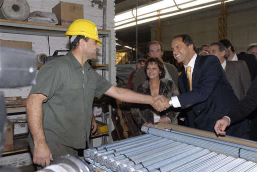 27/04/07 Continuando con la extensa agenda que realizaron durante su visita el futuro candidato a gobernador de la provincia de Buenos Aires, Daniel Scioli, y el actual Felipe Solá, junto al intendente municipal Carlos Selva en la ciudad, se acercaron hasta el predio de la firma Aceros Borroni SA. Allí los mandatarios recorrieron la planta industrial junto a su titular, Juan Pablo Borroni, y realizaron el tradicional corte de cintas en el ingreso a una de las nuevas naves que tendrá la firma para la realización de sus diversos productos vinculados con la varilla roscada. En esta oportunidad los funcionarios provinciales y nacionales no realizaron discursos, pero sí conocieron en profundidad el funcionamiento de la empresa y hasta el vicepresidente de la Nación, Daniel Scioli, se llevó una tuerca como presente.