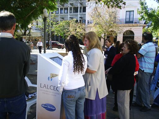 09/04/07 Lalcec filial Mercedes impulsa una campaña informativa que incluye una encuesta electrónica Entre este lunes y martes permanecerá en la plaza San Martín un móvil con una técnica de la empresa Pfizer. Realizan encuestas a quienes se acerquen para conocer el grado de sus factores de riesgo de tener cáncer. Es gratis. Quienes eligen saber sobre su salud completaron la encuesta, esta mañana
