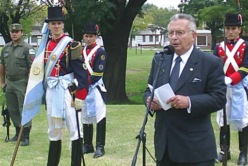 14/04/07 El Regimiento de Infantería Nº 6 “General Viamonte” recordó su llegada a las Islas Malvinas Fue durante un acto que tuvo lugar a 25 años del arribo de los 648 hombres y la guerra. Estuvieron el intendente Carlos Selva y el ex jefe del Regimiento, Jorge Alperín. Recordaron a los once centinelas caídos defendiendo la patria. Ex jefe del Regimiento 6, general retirado Jorge Alperín, dirige un discurso