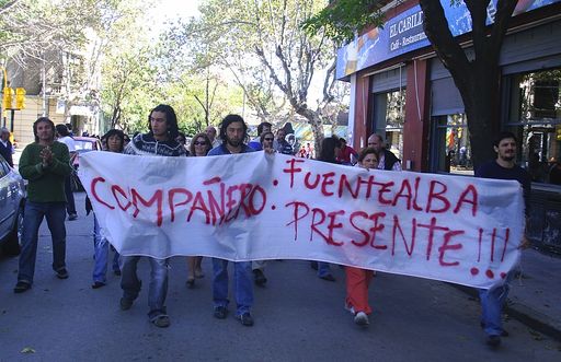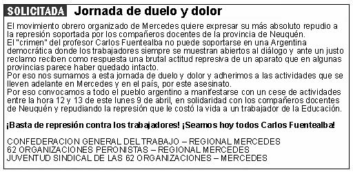 07/04/07 TODOS SOMOS FUENTEALBA. En el marco de un paro nacional, en esta ciudad se hará una movilización este lunes 12 a las 10.30 desde la sede de la ATE, en avenida 17 entre 30 y 28, convocada por el Frente Gremial Docente y en repudio a la violenta represión que terminó con la vida de un docente (foto) en Neuquén. Adhieren organizaciones políticas varias, entre ellas la Corriente Proyecto Nacional que lidera David Valerga y el ARI con Claudia Lucero.