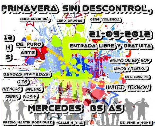 Bajo el lema “Primavera sin descontrol, cero alcohol, cero drogas, cero violencia”, y con entrada es libre y gratuita, proponen una serie de actividades este 21 de septiembre en el predio del ex Martín Rodríguez. El encuentro, en el que no está permitido vender ni entrar con alcohol, promete “12 horas de puro arte”, con las bandas invitadas OTS, Vivencias, InVenas, Plash! y Zeven; y coreografías, mimos, hip-hop a cargo de United Teknon, en el espacio de calles 6 y 11. Es organizado por un grupo de personas que tienen afinidades comunes denominado “Equipo Nacer”. “Junto a mi esposo, desde hace 5 años, estamos trabajando con un equipo, conformado por adolescentes, jóvenes y matrimonios jóvenes, quienes trabajan con nosotros junto a todos sus hijos”, indicó Marta, una de las organizadoras. “Nuestro trabajo es amplio, realizamos trabajos sociales, cuando se presenta alguna necesidad, y nos encanta llevar el arte (música, danza, teatro) de una manera sana a cualquier parte y nivel social. Realizamos en las plazas fiestas infantiles en el día del niño y reyes, juntamos juguetes que no sólo son entregados allí sino también en el hospital y en el merendero ‘Manos Solidarias’”, agregó sobre la actividad del grupo. Y consultada por NOTICIASMERCEDINAS.COM sobre cómo nació la idea de festejar de una manera distinta el día de la primavera, indicó que se trata de “un deseo de nuestro corazón desde hace como 3 años”: “Es un gran desafío que nos costaba afrontar, pero este año decidimos poner manos a la obra. Lo que nos impulsó es no sólo dar otra opción a nuestros hijos y a los que conformamos este equipo, sino también a todos los chicos y padres que no están para nada de acuerdo con lo que cada año vivimos en nuestra ciudad y que sólo se escuchan lamentaciones y no soluciones”, marcó. “La idea es realizar este evento para toda la familia. Comenzará a las 12 del mediodía con un tiempo de recreación con deportes y mateada, y más o menos a las 18 horas comenzaremos con la participación de varias bandas. Tres son de capital y tres de Mercedes. También tendremos la participación de un grupo de arte callejero que se llama United Teknon (de Derqui) que traen obras de teatros, mimos y coreografías de hip hop. Son espectaculares esos chicos”, amplió. “Esperamos que la gente tome conciencia y sobre todo nuestra confianza esta puesta en Dios que no permitirá nada malo, tenemos mucha fe de que será el comienzo de algo maravilloso para nuestra ciudad y que será establecido como una fiesta donde mostraremos que ni el alcohol ni ninguna otra cosa que nos perjudique como personas y como ciudadanos tiene que ser establecido como centro de diversión, porque no es lo que queremos dejarle como herencia a las próximas generaciones”, completó la mujer.