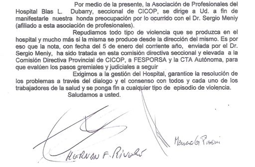 Desde la CICOP Mercedes enviaron una nota a la dirección del hospital Dubarry, al Ministerio de Salud y a todo el arco gremial en su conjunto luego de un episodio de violencia sufrido por un profesional por parte de uno de los directivos del centro de salud. “Realmente desde la Asociación de Profesionales lamentamos este tipo de episodios y más cuando los mismos vienen desde la dirección del hospital”, indicó al respecto el doctor Hernán Rivero, de la CICOP, cuestionando el uso de “resoluciones internas intimidatorias y violencia verbal” para la solución de los problemas. “Desde la seccional CICOP Mercedes seguiremos bregando por el diálogo y el consenso y repudiamos este tipo de episodios, que se han hecho habituales en estos últimos meses”, puntualizó Rivero. “Esta gestión que comenzó hace más de una década está agotada y solicitaremos una reunión a la brevedad, a través de nuestros paritarios de CICOP, con la nueva ministra, y con la nueva dirección, a fin de informarle el estado de situación del Hospital Blas Dubarry”, indicó. Lo cierto es que en la nota enviada se plantea que el doctor Sergio Meniy, afiliado a la seccional de CICOP fue objeto de una agresión por parte del directivo Higinio García Aloisio, quien de manera verbal maltrató al profesional y esto es denunciado desde el gremio.